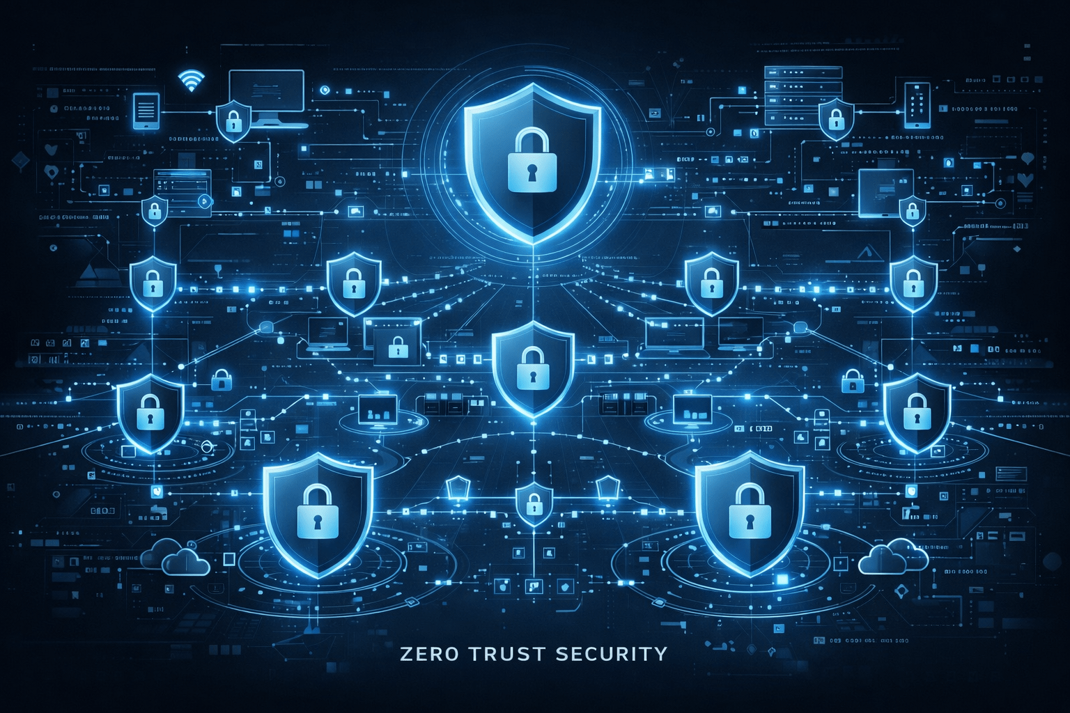 Zero Trust & RBAC adalah pendekatan keamanan siber enterprise yang menolak model kepercayaan implisit — setiap pengguna, perangkat, dan sesi harus diverifikasi ulang setiap saat, bukan hanya saat login pertama. Pendekatan ini berbeda dari model perimeter tradisional yang menganggap pengguna di dalam jaringan otomatis aman.